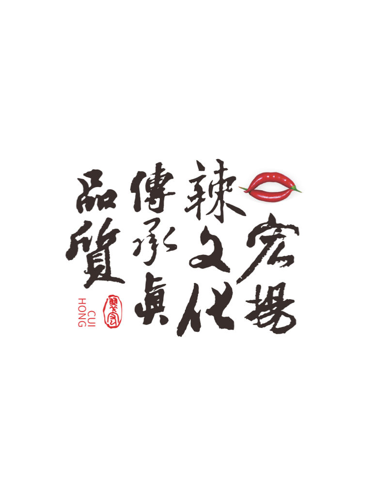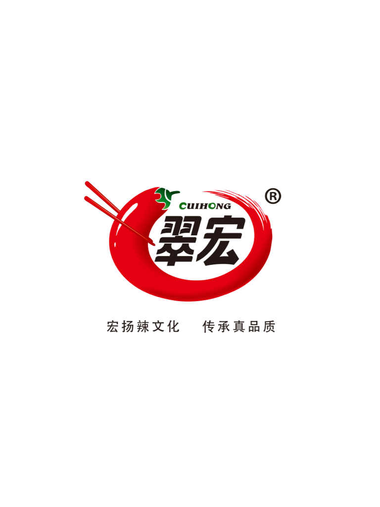 翠宏新品牌,整体造型以体现企业行业特性辣椒为设计亮点,“宏扬辣文化,传承真品质”传递企业理念。品牌造型创新、大气、稳重,突显企业行业特性,整个辣椒造型为翠拼音开头大写字母“C”创作,辣椒融和筷子造型为宏拼音开头大写字母“H”。名称翠宏字体绿色部分相连寓意产品绿色天然健康。整体品牌造型也是圆形碗碟与筷子的融和