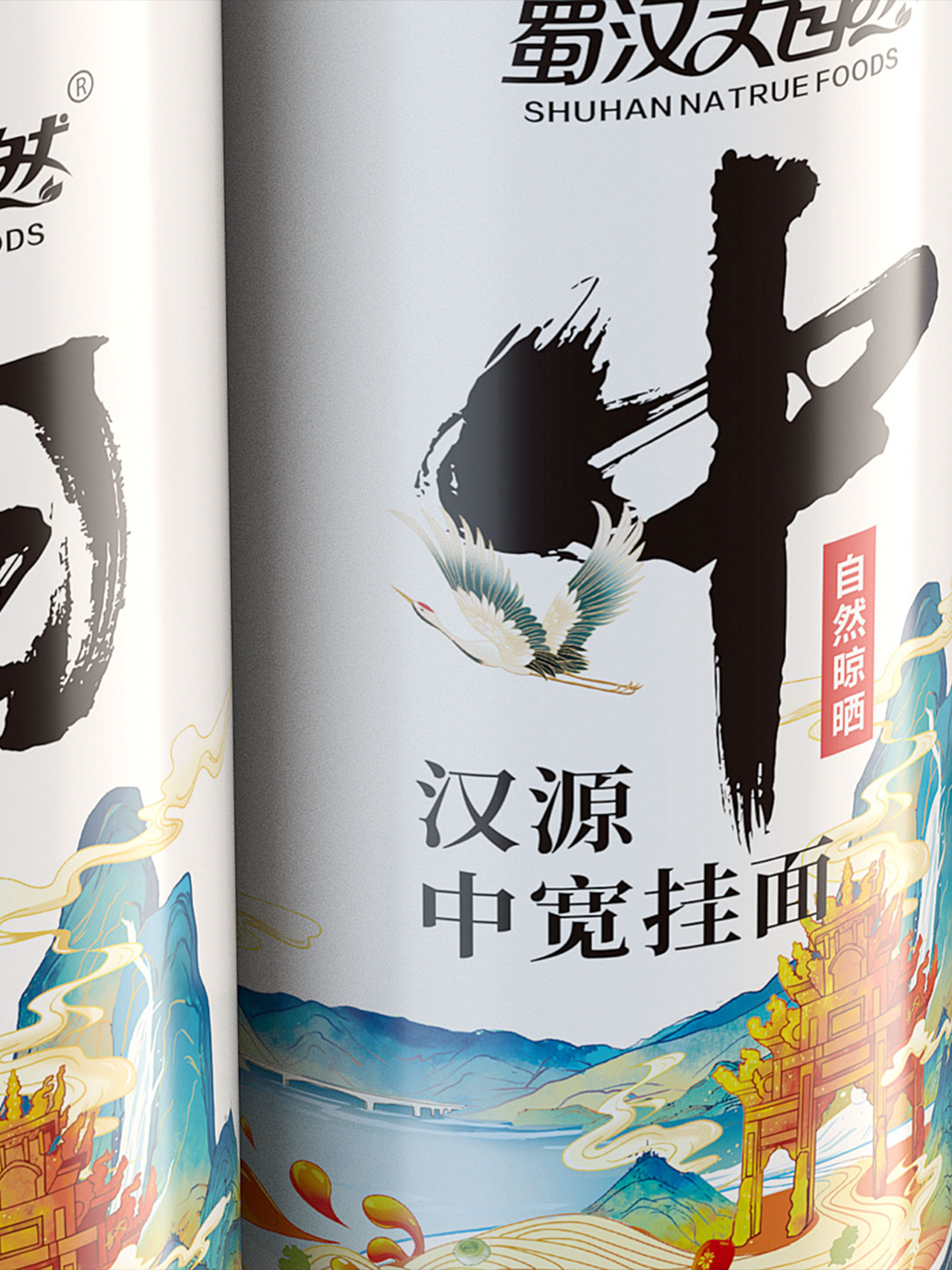 新消费趋势之下,作为生活刚需的面制品,除了注重在产品品质与口感上的创新,在品牌设计上也加入了与以往不同的创意,今天分享一款汉源挂面的包装设计,一款具有意境感的插画包装,仙鹤、群山、流水,设计师把汉源地方的山水风景跟产品巧妙的融入在一起。给人一种意境中回归到大自然的感觉,体现了产品的天然与绿色。